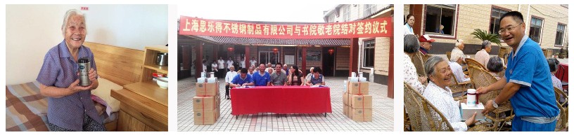 2014年重阳将至,又是一年敬老时。带着一箱箱早早就准备好的特别定制的保温杯,思乐得一行人员来到浦东书院镇敬老院。老人们 个个脸上洋溢着快乐的笑脸,感染了现场的每一个人。待我们华发满头时,是否也如这般的欢乐呢?总有一天,我们就成了他们,我们也会老去,关爱老人就是关爱自己的未来!分发完重阳礼品后,走访老人们的住处。在一位九十多岁高龄严奶奶的房间里,意外地发现了一只约二十年前,思乐得生产的老款真空保温杯,杯身上的不锈钢早已被抚得光亮。